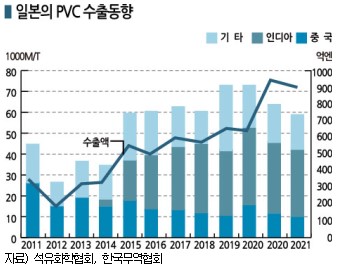 일본은 PVC 수출액이 2021년과 2022년에 걸쳐 2년 연속 900억엔을 돌파했다.