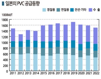 일본은 2022년 PVC 생산량이 149만톤4000톤으로 전년대비 4.9% 줄어 코로나19 팬데믹(Pandemic: 세계적 대유행) 이전인 2019년을 마지막으로 3년 연속 감소한 것으로 추정된다.