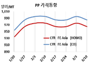 아시아 PP 시세는 3월8일 CFR FE Asia 기준 라피아(Raffia) 및 인젝션(Injection) 그레이드가 톤당 965달러, IPP Film 및 BOPP는 970달러, 블록 코폴리머(Block Copolymer)는 985달러로 각각 10달러 하락했다.
