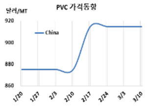 PVC(Polyvinyl Chloride)는 보합세를 장기화하고 있다. PVC 시세는 3월8일 CFR China가 톤당 915달러, CFR SE Asia는 895달러로 변동이 없었고 CFR India도 935달러로 보합세를 형성했다. 표, 그래프: <PVC 가격동향> <화학저널 2023/03/14> |