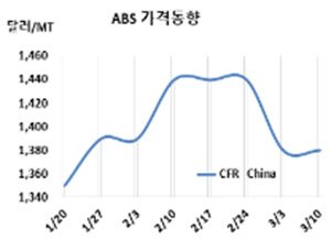 ABS(Acrylonitrile Butadiene Styrene)는 보합세를 형성했다. ABS 시세는 3월8일 CFR China 톤당 1380달러, CFR SE Asia도 1410달러로 변동이 없었다. CFR S Asia 역시 1440달러로 보합세를 형성했다. 표, 그래프: <ABS 가격동향> <화학저널 2023/03/15> |