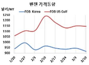 벤젠(Benzene)은 900달러가 위험해졌다. 벤젠 시세는 3월10일 FOB Korea가 톤당 915달러로 30달러 하락했으며 CFR SE Asia는 935달러로 15달러 떨어졌다. CFR China도 940달러로 15달러 하락했다. 표, 그래프: <Benzene 가격동향> <화학저널 2023/03/15> |