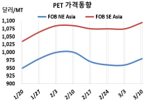PET(Polyethylene Terephthalate)는 일제히 상승했다. 병(Bottle) 그레이드 PET 시세는 3월8일 FOB NE Asia 980달러로 20달러, FOB SE Asia도 1095달러로 20달러 상승했다. CFR S Asia는 1040달러로 25달러 올랐다. 표, 그래프: <PET 가격동향> <화학저널 2023/03/16> |