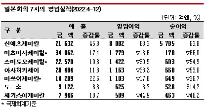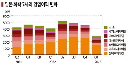 일본 화학 메이저 7사는 석유화학 사업에서 원료가격이 폭등하고 수요부진이 장기화됨에 따라 영업이익이 감소했고 그동안 수익성 개선을 견인해온 반도체, 디스플레이 등 전자소재 사업까지 제동이 걸리면서 일부를 제외하고 두자릿수 마이너스 성장한 것으로 파악된다.