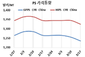 PS(Polystyrene)는 범용 그레이드가 폭락했다. GPPS(General Purpose PS) 시세는 3월15일 CFR China가 1235달러로 20달러 하락했고, CFR SE Asia는 1235달러로 30달러, CFR India도 1265달러로 30달러 폭락했다. 표, 그래프: <PS 가격동향> <화학저널 2023/03/22> |