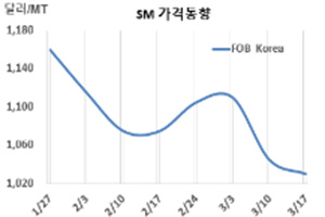 SM(Styrene Monomer)은 1000달러가 위험해지고 있다. SM 시세는 3월17일 FOB Korea가 톤당 1030달러로 15달러, CFR SE Asia는 1060달러로 20달러 하락했다. CFR China와 CFR Taiwan 1035달러로 20달러 떨어졌고, CFR India는 1085달러로 15달러 하락했다. 표, 그래프: <SM 가격동향> <화학저널 2023/03/22> |