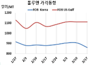 FOB Korea 860달러로 45달러 떨어져 … 유럽 폭락세에 미국 보합세
