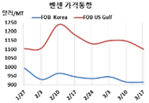 벤젠(Benzene)은 보합세를 형성했다. 벤젠 시세는 3월17일 FOB Korea가 톤당 915달러로 변동이 없었으며 CFR SE Asia는 930달러로 5달러 하락했다. CFR China도 935달러로 5달러 떨어졌다. 표, 그래프: <Benzene 가격동향> <화학저널 2023/03/22> |