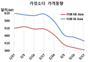 표, 그래프: <가성소다 가격동향> <화학저널 2023/03/24> |