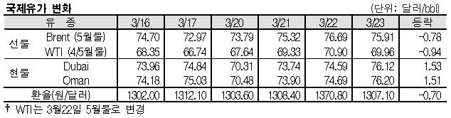 3월23일 국제유가는 미국의 전략비축유 구입 연기로 하락했다. 국제유가는 미국의 전략비축유 구입 연기로 하락했다. 표, 그래프: <국제유가 변화> <화학저널 2023/03/24> |