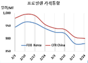 프로필렌(Propylene)은 소폭 하락했다. 프로필렌 시세는 3월24일 FOB Korea가 톤당 880달러로 변동이 없었으나 CFR SE Asia는 915달러로 10달러 하락했다. CFR China는 900달러로 5달러, CFR Taiwan은 900달러로 10달러 떨어졌다. 표, 그래프: <Propylene 가격동향> <화학저널 2023/03/28> |