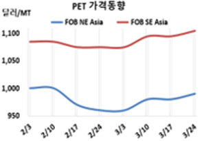 PET(Polyethylene Terephthalate)는 소폭 상승했다.
