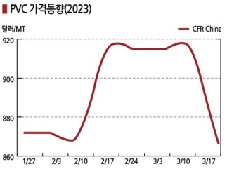 PVC 현물가격은 3월15일 CFR China가 톤당 870달러로 45달러, CFR India도 905달러로 30달러 폭락했다.