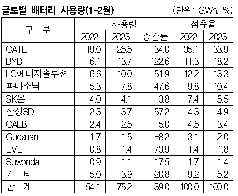 1-2월 점유율 23.7%로 하락 … 비야디가 CATL 이어 2위 부상