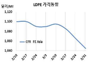 LDPE(Low-Density Polyethylene)는 추락하고 있다. LDPE 시세는 3월29일 CFR FE Asia가 톤당 1045달러로 20달러, CFR SE Asia는 1090달러로 20달러 하락했다. 표, 그래프: <LDPE 가격동향> <화학저널 2023/04/03> |