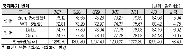 4월3일 국제유가는 OPEC(석유수출국기구)+의 추가 감산으로 폭등했다. 국제유가는 OPEC+ 일부 회원국이 2023년 5-12월 166만배럴을 추가 감산한다고 발표한 영향으로 폭등했다. 표, 그래프: <국제유가 변화> <화학저널 2023/04/04> |