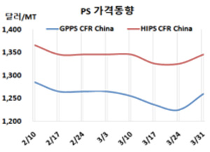 PS(Polystyrene)는 반등에 성공했다. GPPS(General Purpose PS) 시세는 3월29일 CFR China가 1260달러로 35달러 급등했고 CFR SE Asia는 1245달러로 20달러, CFR India도 1265달러로 20달러 상승했다. 표, 그래프: <PS 가격동향> <화학저널 2023/04/05> |
