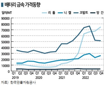 리튬은 중국이 2023년부터 신에너지 자동차(NEV) 보조금을 전면 폐지하면서 기대수요가 위축됐고 리튬 광산 투자로 공급 증가 요인이 작용하며 2022년 1분기 수준으로 하락했다.