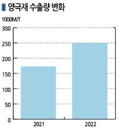 한국무역협회에 따르면, 2022년 양극재 수출액은 112억976만달러로 전년대비 160.2% 폭증했고, 수출량은 25만5103톤으로 43.7% 급증하며 사상 최대를 기록했다. 수출량은 LCO가 4138톤, NCM이 19만9072톤, NCA가 4만7768톤, NCMA가 137톤으로 나타났다.