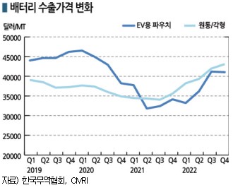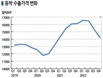 한국산 동박 수출가격은 2022년 상반기 톤당 1만6300달러를 상회했으나 3분기 1만5148달러, 4분기 1만4151달러로 하락했고 2023년 1월에는 1만3979달러로 폭락했다.