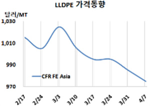 LLDPE(Linear Low-Density Polyethylene)는 하락세가 계속됐다. LLDPE 시세는 4월5일 CFR FE Asia가 톤당 975달러로 10달러, CFR SE Asia는 1020달러로 10달러 하락했다. 지난주 폭락했던 CFR S Asia는 다시 1060달러로 20달러 떨어졌다. 표, 그래프: <LLDPE 가격동향> <화학저널 2023/04/10> |