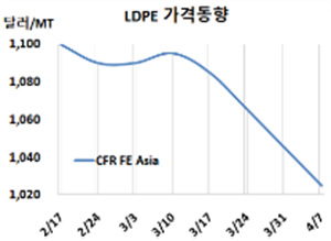 LDPE(Low-Density Polyethylene)는 추락하고 있다. LDPE 시세는 4월5일 CFR FE Asia가 톤당 1025달러로 20달러, CFR SE Asia는 1070달러로 20달러 하락했다. 전주에 폭락했던 CFR India는 1090달러로 10달러 하락에 그쳤다. 표, 그래프: <LDPE 가격동향> <화학저널 2023/04/10> |