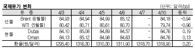 브렌트유, 84.18달러로 0.94달러 떨어져 … 두바이유는 84.76달러