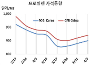프로필렌(Propylene)은 연속 상승했다. 프로필렌 시세는 4월7일 FOB Korea가 톤당 900달러로 10달러, CFR SE Asia는 940달러로 10달러 상승했다. CFR China는 920달러로 10달러, CFR Taiwan은 930달러로 5달러 올랐다. 표, 그래프: <Propylene 가격동향> <화학저널 2023/04/11> |