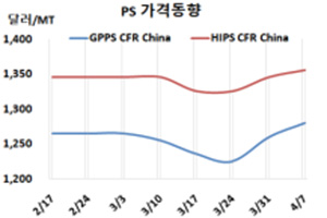 GPPS(General Purpose PS) 시세는 4월5일 CFR China가 1280달러로 20달러, CFR SE Asia는 1265달러로 20달러, CFR India도 1275달러로 10달러 상승했다.