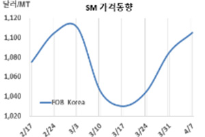FOB Korea 1105달러로 20달러 상승 … 미국은 1039달러 형성