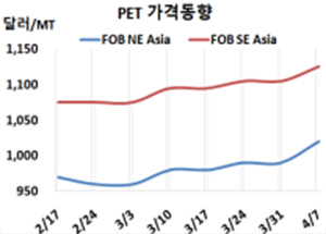 FOB NE Asia 1020달러로 30달러 급등 … MEG·PTA 상승세 영향