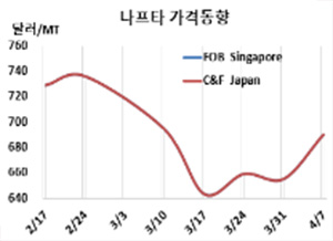 ![]() 나프타 시세는 4월7일 C&F Japan 톤당 690달러로 35달러 폭등했다.