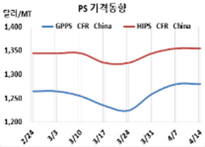 PS(Polystyrene)는 변동이 없었다. GPPS(General Purpose PS) 시세는 4월12일 CFR China가 1280달러, CFR SE Asia는 1265달러로 변동이 없었다. CFR India도 1275달러로 보합세에 머물렀다. 표, 그래프: <PS 가격동향> <화학저널 2023/04/19> |
