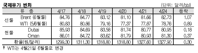 4월24일 국제유가는 중국 수요 증가 영향으로 상승했다. 국제유가는 중국에서 5월 노동절 연휴 여행 예약이 증가한 영향으로 상승했다. 표, 그래프: <국제유가 변화> <화학저널 2023/04/25> |