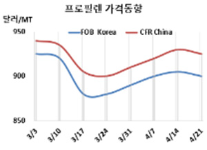 프로필렌 시세는 4월21일 FOB Korea가 톤당 900달러, CFR SE Asia는 940달러로 각각 5달러 하락했다. CFR China는 925달러, CFR Taiwan도 930달러로 각각 5달러 떨어졌다.