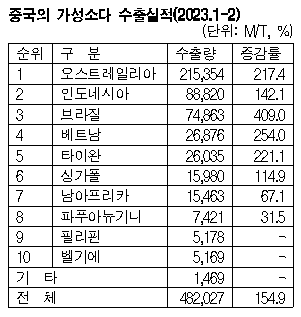 중국이 가성소다(Caustic Soda) 수출을 적극화하고 있다. 표, 그래프: <중국의 가성소다 수출실적(2023.1-2)> <화학저널 2023/04/28> |