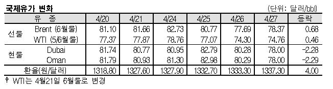 4월27일 국제유가는 위험자산 선호심리를 타고 상승했다. 4월27일 국제유가는 미국 증시 상승에 따라 위험자산 선호심리가 회복되며 상승했다. 표, 그래프: <국제유가 변화> <화학저널 2023/04/28> |