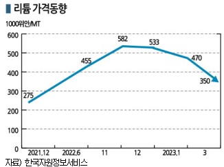 탄산리튬은 2019-2020년 kg당 5-6달러 수준에 거래됐으나 2022년 95달러로 사상 최고치를 넘어섰고 2023년 초에도 70-80달러대 강세를 나타냈으나 3월 이후 50달러 수준으로 폭락했다.