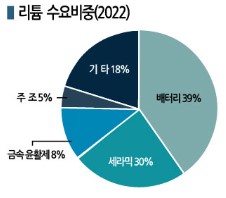 세라믹은 2022년 리튬 생산량의 30% 가량을 차지했으나 중국을 중심으로 건설 경기가 꺾이면서 2023년에는 세라믹용 수요의 25%(3만톤)가 줄어들 것으로 예상된다. 전기자동차 1대에는 리튬 30-60kg이 들어간다.