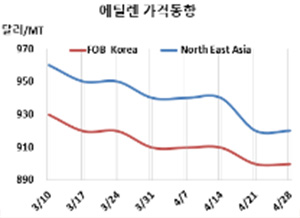 에틸렌(Ethylene)은 변동이 없었다. 에틸렌 시세는 4월28일 CFR NE Asia가 톤당 920달러, CFR SE Asia는 950달러로 변동이 없었다. FOB Korea도 900달러로 보합세를 형성했다. 표, 그래프: <Ethylene 가격동향> <화학저널 2023/05/02> |