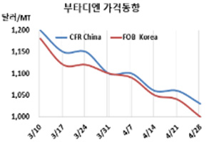 부타디엔(Butadiene)은 또다시 하락했다. 부타디엔 시세는 4월28일 FOB Korea가 톤당 1000달러로 40달러 하락했고 CFR SE Asia는 960달러로 20달러 떨어졌다. CFR China와 CFR Taiwan도 1030달러로 30달러 하락했다. 표, 그래프: <Butadiene 가격동향> <화학저널 2023/05/03> |