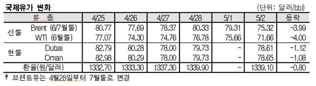 표, 그래프: <국제유가 변화> <화학저널 2023/05/03> |