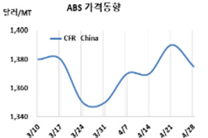 ABS(Acrylonitrile Butadiene Styrene)는 하락이 불가피했다. ABS 시세는 4월26일 CFR China가 톤당 1375달러로 15달러, CFR SE Asia는 1410달러로 20달러 하락했다. CFR S Asia도 1450달러로 10달러 떨어졌다. 표, 그래프: <ABS 가격동향> <화학저널 2023/05/03> |