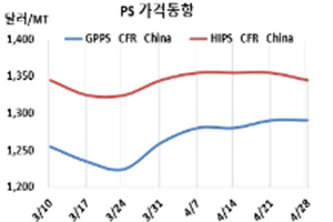 PS(Polystyrene)는 고충격 그레이드만 하락했다. GPPS(General Purpose PS) 시세는 4월26일 CFR China가 1290달러, CFR SE Asia는 1275달러로 변동이 없었다. CFR India도 1315달러로 보합세를 형성했다. 표, 그래프: <PS 가격동향> <화학저널 2023/05/03> |
