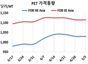 PET(Polyethylene Terephthalate)는 1000달러를 유지했다. 병(Bottle) 그레이드 PET 시세는 5월3일 FOB NE Asia가 1030달러, FOB SE Asia도 1115달러로 변동이 없었다. CFR S Asia도 1045달러로 보합세를 형성했다. 표, 그래프: <PET 가격동향> <화학저널 2023/05/11> |
