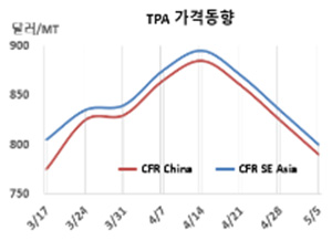 PTA(Purified Terephthalic Acid)는 하락세가 커지고 있다. PTA 시세는 5월5일 CFR China가 톤당 790달러로 35달러, CFR SE Asia도 800달러로 35달러 하락했다. CFR India 역시 825달러로 30달러 떨어졌다. 표, 그래프: <TPA 가격동향> <화학저널 2023/05/11> |