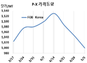 P-X(Para-Xylene)는 연속 하락했다. P-X 시세는 5월5일 FOB Korea가 톤당 1000달러로 45달러 급락하고 CFR SE Asia도 1025달러로 40달러 하락했다. CFR Taiwan는 1015달러로 50달러 급락했다. 표, 그래프: <P-X 가격동향> <화학저널 2023/05/11> |