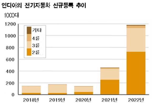 인디아는 전기자동차(EV) 판매가 급증하고 있다. 표, 그래프: <인디아의 전기자동차 신규등록 추이> <화학저널 2023/05/12> |