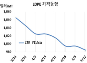 LDPE(Low-Density Polyethylene)는 모두 10달러 떨어졌다. LDPE 시세는 5월10일 CFR FE Asia 톤당 985달러, CFR SE Asia 1050달러로 각각 10달러 떨어졌다. CFR India도 1060달러로 10달러 하락했다. 표, 그래프: <LDPE 가격동향> <화학저널 2023/05/15> |