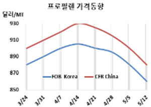 프로필렌(Propylene)은 4주 연속 하락했다. 프로필렌 시세는 5월12일 FOB Korea가 톤당 860달러로 20달러, CFR SE Asia도 895달러로 20달러 하락했다. CFR China는 880달러, CFR Taiwan은 895달러로 각각 20달러 떨어졌다. 표, 그래프: <Propylene 가격동향> <화학저널 2023/05/16> |